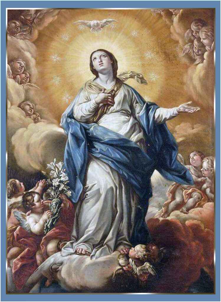 E no silêncio daquele Sancta Sanctorum da Eterna Sabedoria, fez-se um maior silêncio –se isto for possível no Céu–; porque a Senhora, diante da roçadura silenciosa do beijo divino, entra Assunta, envolvida, penetrada, saturada e impelida pela corrente divina do Espírito Santo, na câmara daquele divino Consorte que a criara e predestinara desde toda a Eternidade, para fazê-la a Criação-Mãe da criação, depois da alma de Jesus…